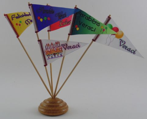 Todas as bandeiras, inclusive as de aperitivo são confeccionadas em tecido. As bandeiras que não tem a costura em sua borda são seladas a fogo para que não desfiem.